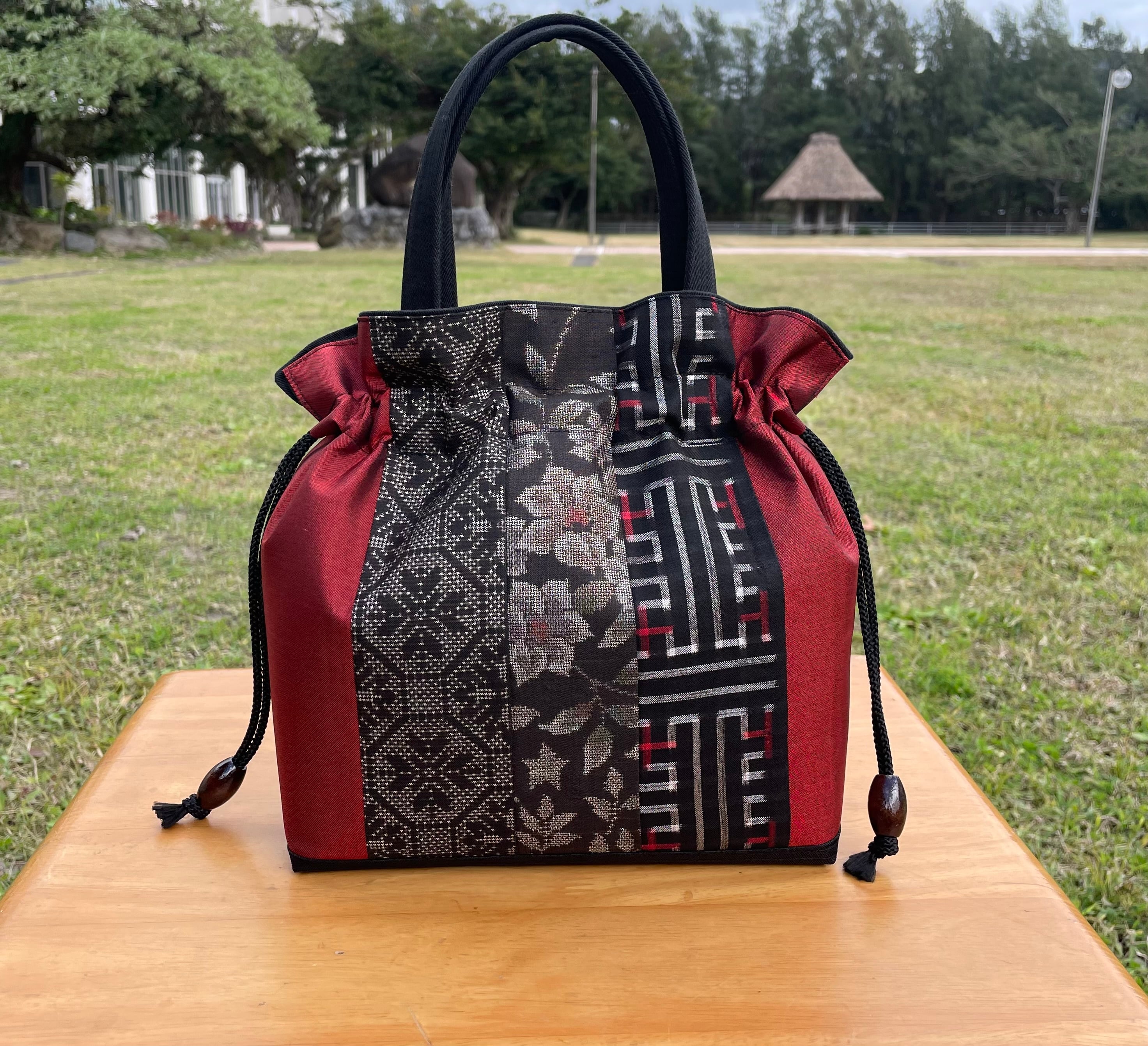 上品でありながら、日常使いにも最適のバッグ、大島紬の巾着バッグ・赤です。 本場奄美大島紬を使用し、側面に無地大島の赤色が洗練された雰囲気を演出します。機能面も優れた一品です!