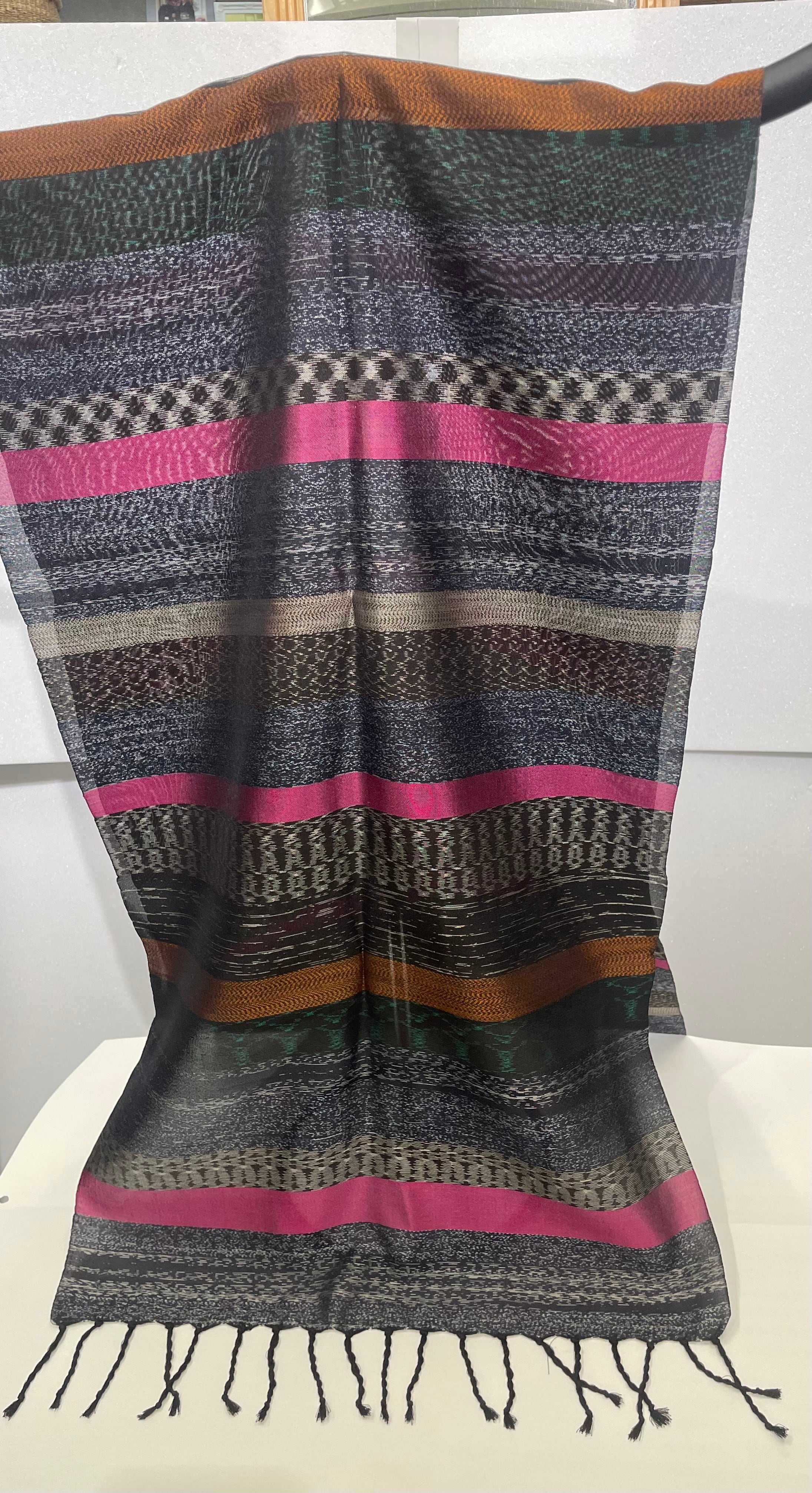 このストールは、独特の透け感を持ち、糸に強い撚りをかけることにより、軽やかで美しい風合いを生み出しています。奄美大島の豊かな自然と文化を感じることができる、まさに特別なアイテムです!