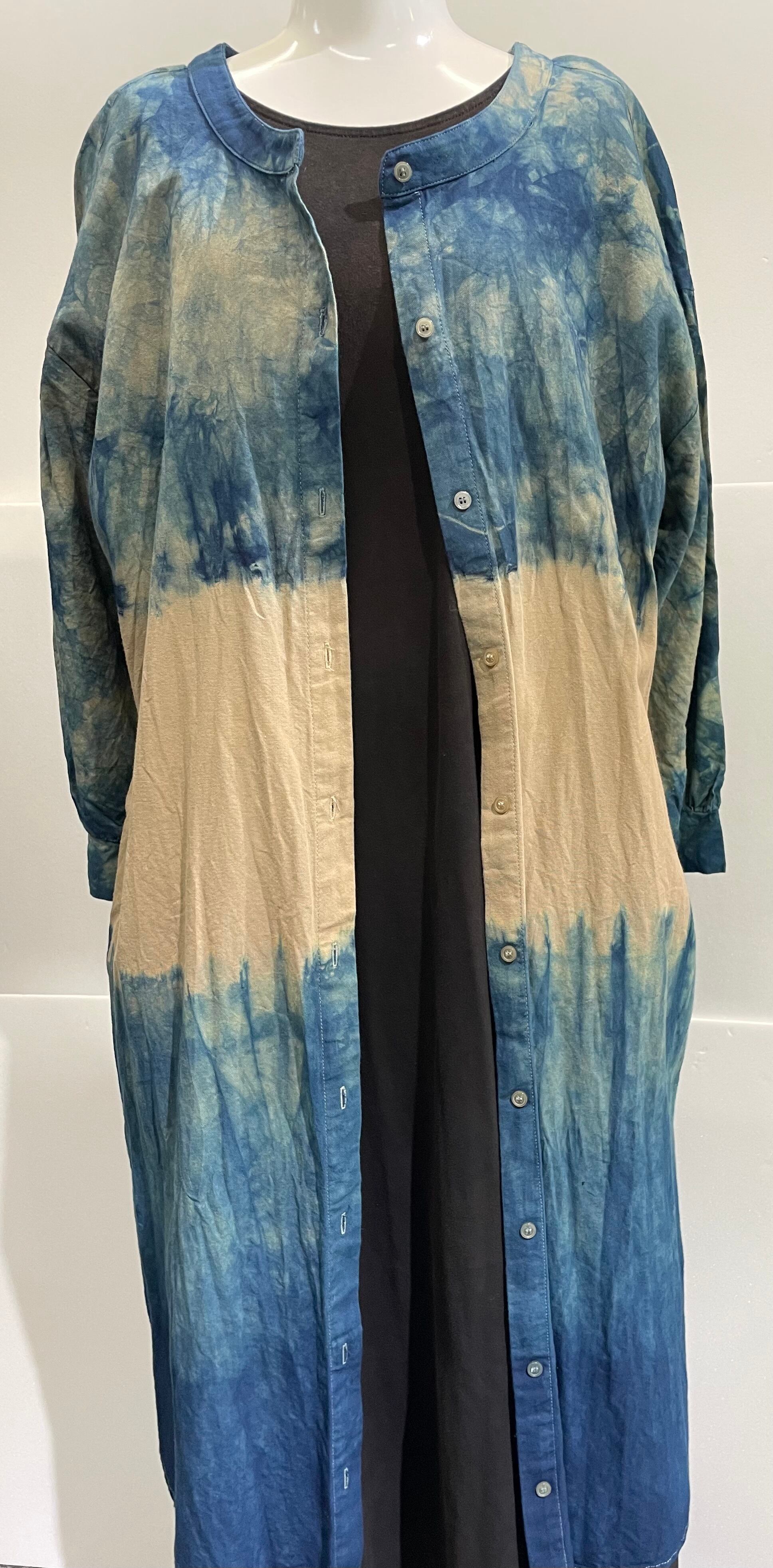 この藍染ワンピースは、サンドベージュの素材をいかした優しい色合いが特徴です。7分袖デザインで、季節を問わず快適に着こなすことができるため、普段のコーディネートに彩りを添えます!新鮮で洗練された印象を与え、カジュアルなシーンからお出かけまで幅広く活躍することでしょう。オーナーの手仕事が息づくこの一枚は、着るほどに愛着が湧き、あなたのスタイルをさらに引き立てます。
