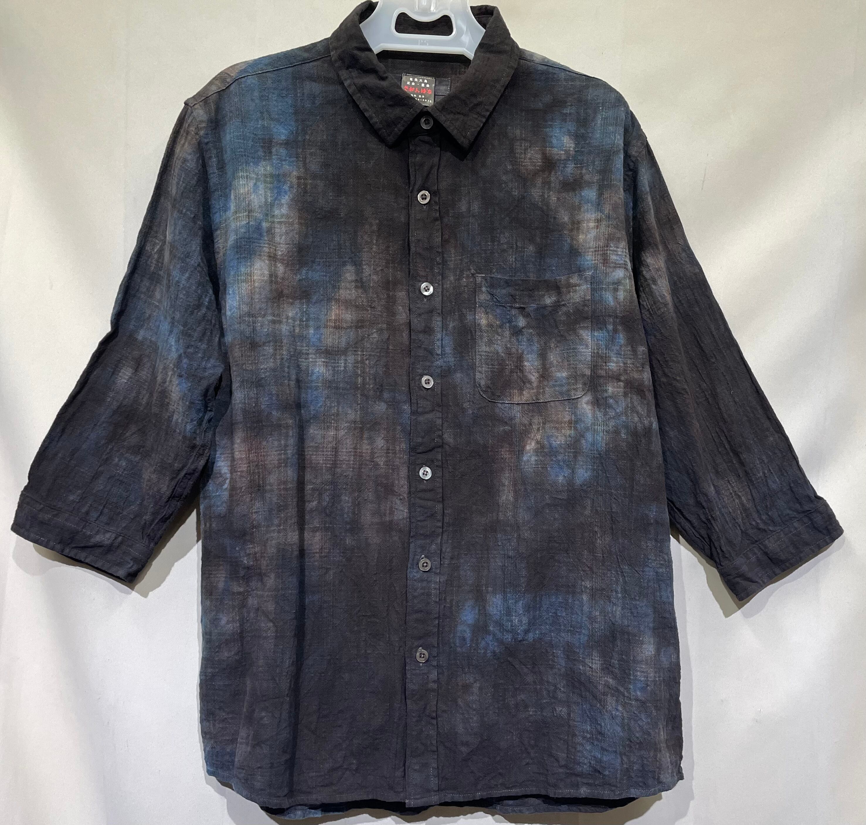 上質な素材と伝統技法が融合した泥藍染メンズシャツ/7分袖/M[ads602-109]が新登場!本商品は、オーナーが手掛けた藍染に加え、泥染め職人による特別な一品です。